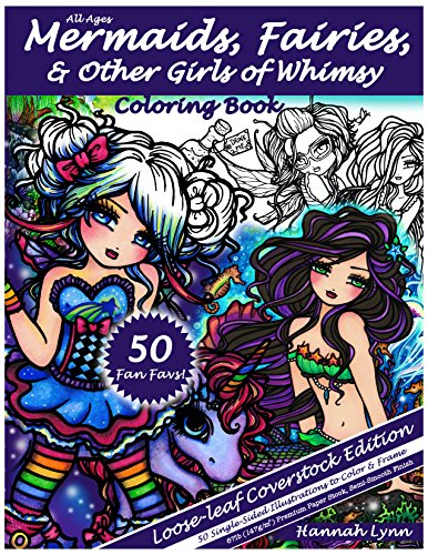 This is the Loose-leaf coverstock version of the popular "Mermaids, Fairies, & Other Girls of Whimsy Coloring Book: 50 Fan Favs", for those looking for a higher paper-quality option. There are 50 8.5"x11" Illustrations for you to frame and color, printed single-sided on 67lb premium Vellum Bristol Cover Stock paper, suitable for markers, pastels, colored pencils, and more! 50 Loose-leaf, unbound pages, with color cover front and back, all in a resealable acid-free crystal clear envelope so you can keep all your pages together. Ships directly from the Artist's Studio! Escape to a magical world of fairies, mermaids, storybook princesses, faraway lands, and more with artist Hannah Lynn! Her whimsical wide-eyed girls have been delighting fans around the world for close to a decade. This ultimate collection coloring book features *50* fan favorites from Hannah's illustrations of classic storybook characters like Snow White and Alice in Wonderland, to the Wizard of Oz, and on to a unique col